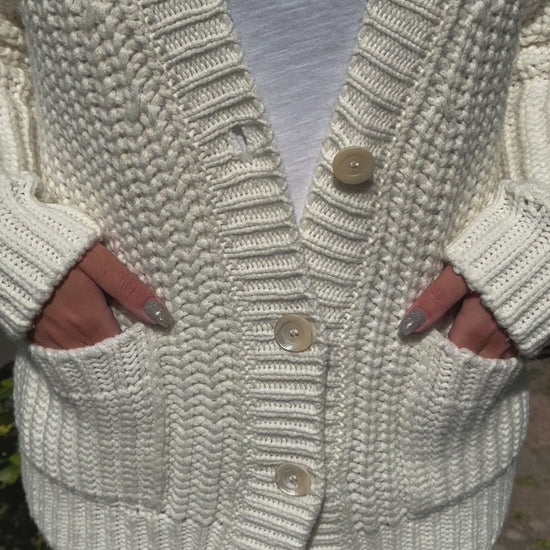 Unsere Strickjacke mit Knöpfen besteht aus 6-fädigem, luxuriösem Cashmere und überzeugt durch ihr grobes Strickbild, den klassischen V-Ausschnitt und ihre lockere Passform. Ideal für kalte Tage – stilvoll, warm und vielseitig kombinierbar.